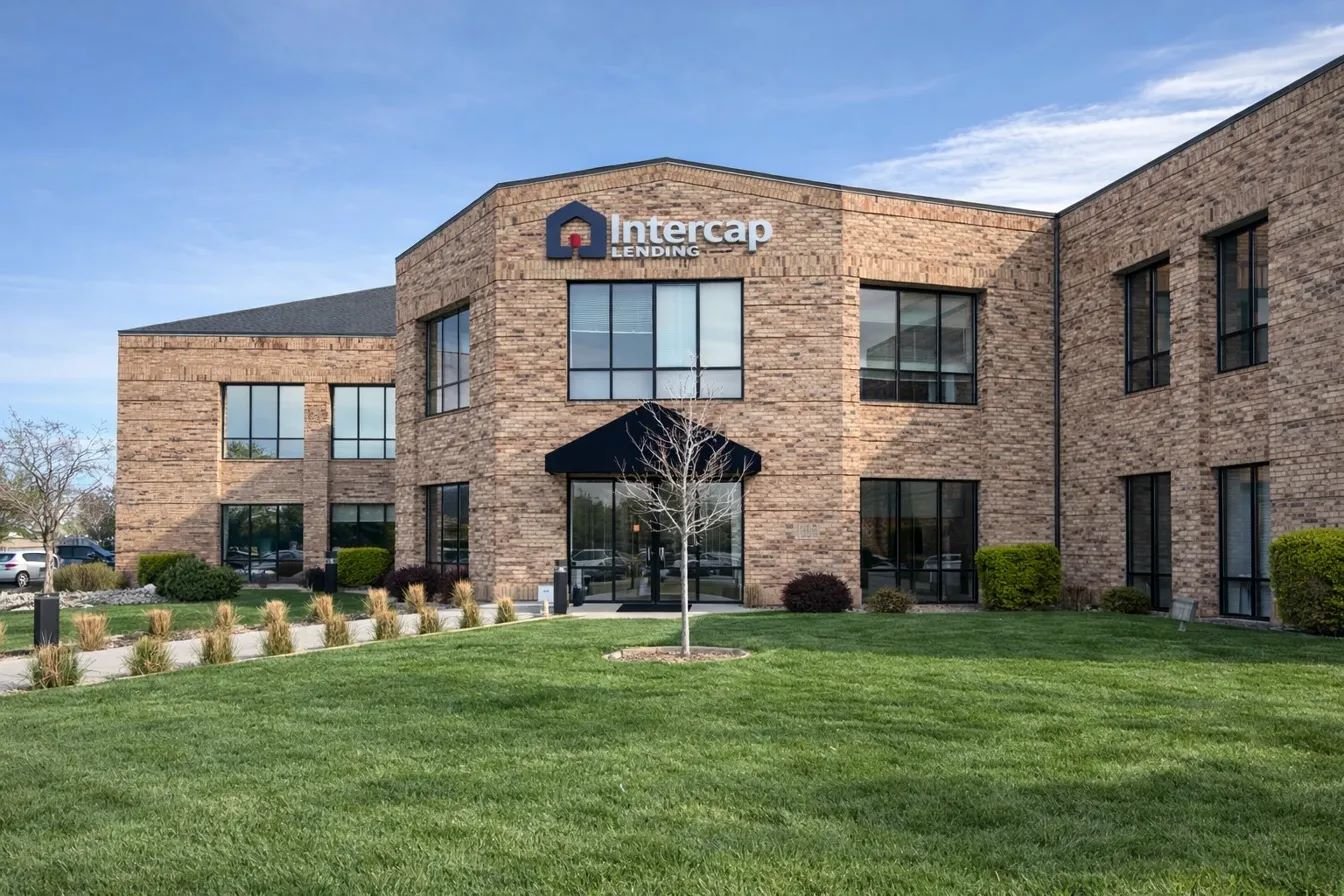 Enter through the main entrance of the building that says Intercap Lending at 5926 S. Fashion Pointe Drive, Suite 120, South Ogden, UT 84403.